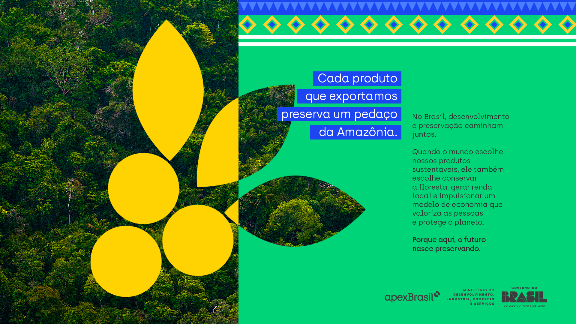 A ApexBrasil tem um papel estratégico nesse cenário: fortalecer a imagem do Brasil como liderança climática, promovendo o país e seus ativos sustentáveis. A campanha destaca a diversidade dos produtos brasileiros, busca estimular investimentos em projetos verdes e impactar positivamente a bioeconomia da Amazônia. Mais do que presença, a ApexBrasil marca sua atuação como elo entre negócios, sustentabilidade e imagem institucional do Brasil.